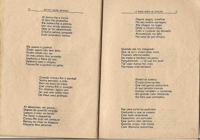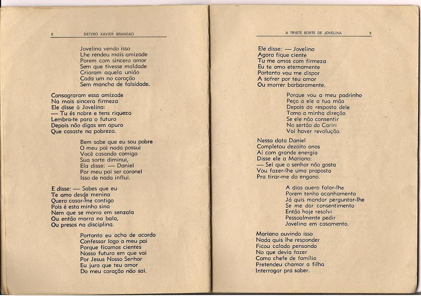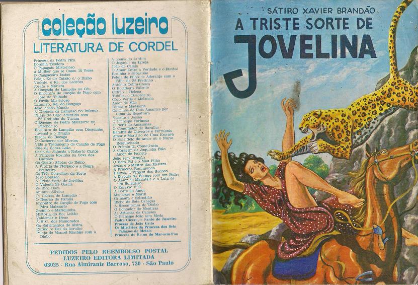 Pessoal, quando olho para o romance "A Triste Sorte de Jovelina", de Sátiro Xavier Brandão, me vem à memória tantos momentos emocionantes de leituras de folhetos em debulhas de feijão nos cafundós do sítio Lages (quem morou na Lages em 90, sabe o cafundó do qual estou falando, lá do outro lado das águas do açude). Na verdade não eram leituras de folhetos e sim recontagem. As contagens e recontagens que me vêm à memória neste momento são as de Zé Mariano. Zé Mariano era um conhecido nosso que ia lá para casa, contar histórias. E por sinal um ótimo contador. Aquelas histórias animavam a mão da gente nas debulhas do paiol de feijão. Um dia ele ia lá para casa ajudar a gente. No outro a gente ia para a casa dele ajudá-lo. Eu viajava nas histórias de Zé. Só que um belo dia, para a minha surpresa, descobri que aquelas histórias que ele contava eram de fato narrações de cordéis que ele havia escutado em algum lugar. Claro que a minha descoberta não me frustrou porque como diz o ditado: "quem conta um conto aumenta um ponto". E então diante do cordel que tinha sido contado por Zé tive a oportunidade de conhecer mais uma versão da história. (Manoel M. Belizario Neto)